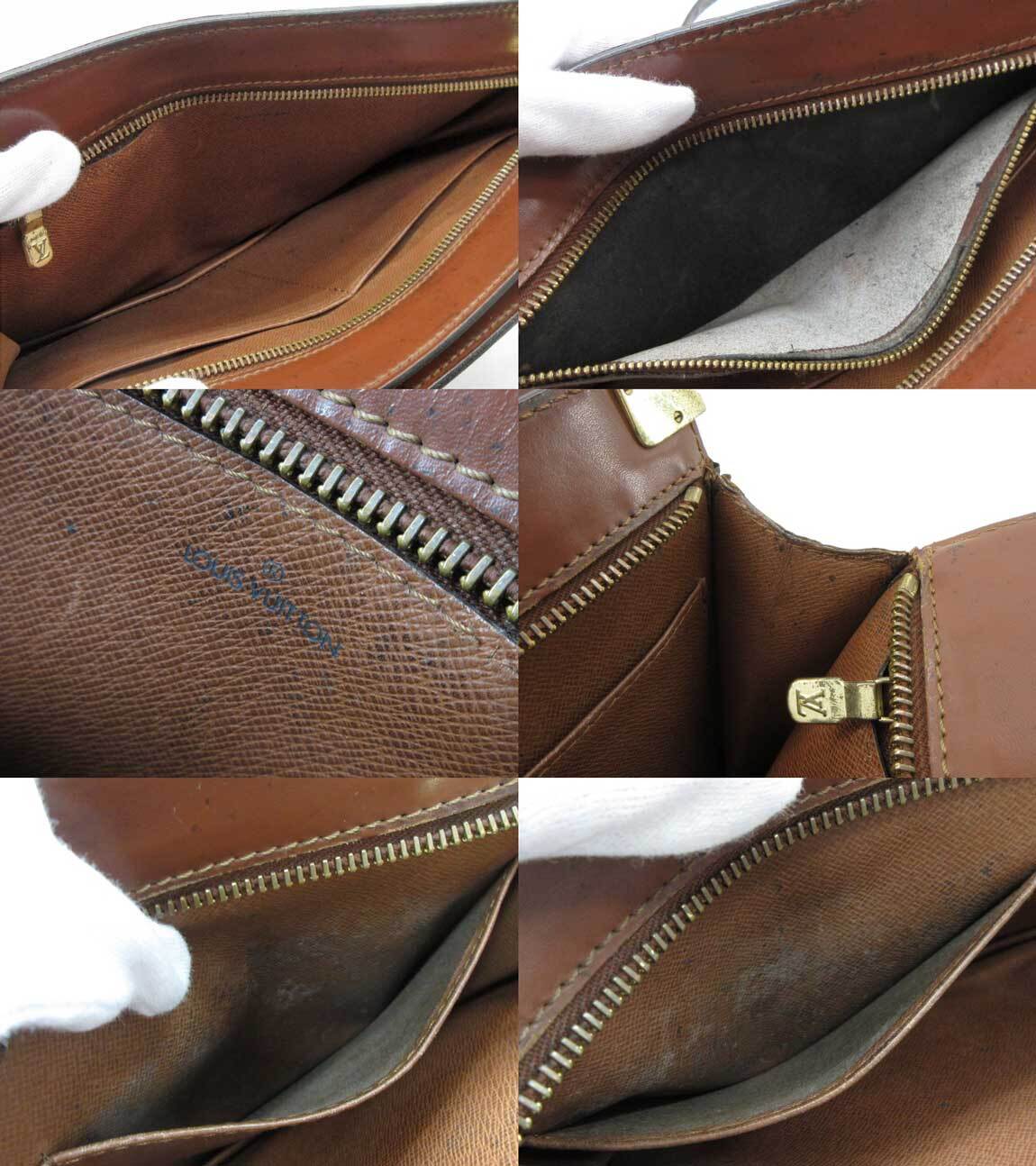 ショルダーストラップの片側の金具が社外品に付け替えられています。汚れ、傷、破れ、割れ、ほつれ、内側劣化等、全体的に使用感あります。